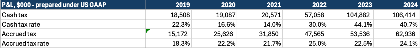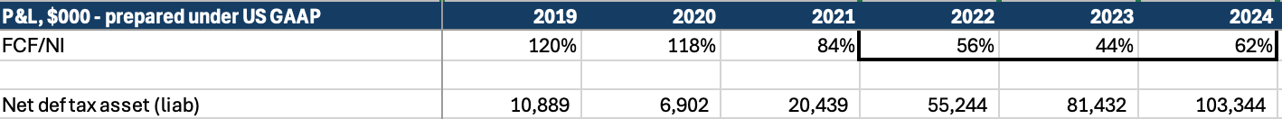The degradation in FCF conversion (FCF/NI) since 2022 is notable, and the absolute conversion in recent years lower than it should be for this business; a range of 80-10% should be expected, on average. Taking a closer look it is largely due to cash taxes being higher than accrued (or book) taxes as deferred tax assets (net of deferred tax liabilities) have grown from $11m to $103m over 5 years: