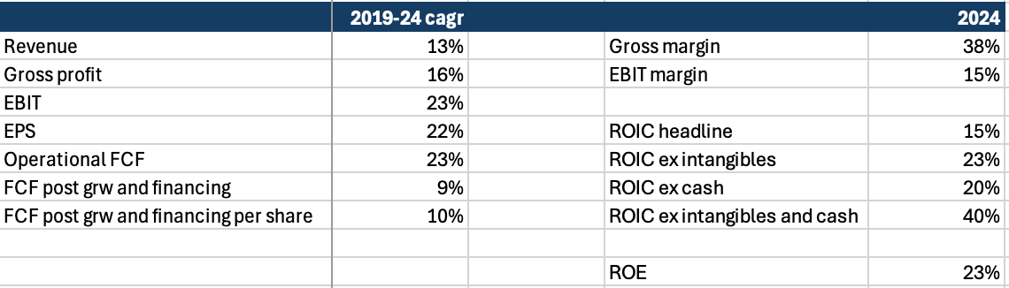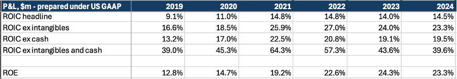 EXL has delivered a marked improvement in returns since 2019, despite the recent industry slowdown. This should partly be credited to the CFO, who joined in 2020 and embedded return metrics more deeply into decision-making, particularly around M&A. Cash and goodwill are both typically about 20-25% of assets as EXL has a semi-regular cadence of bolt-on capability-based acquisitions and typically runs the balance sheet with cash covering the small amount of debt it employs resulting in net debt/EBITDA of 0x (including leases). NOPAT is deducted for stock-based compensation, restructuring and impairment expenses (for detailed accounting explanations of ROIC see Global Spirits: Part III appendix). Operationally – before capital allocation activities – this is an efficient business, earning around a 40% return on capital.